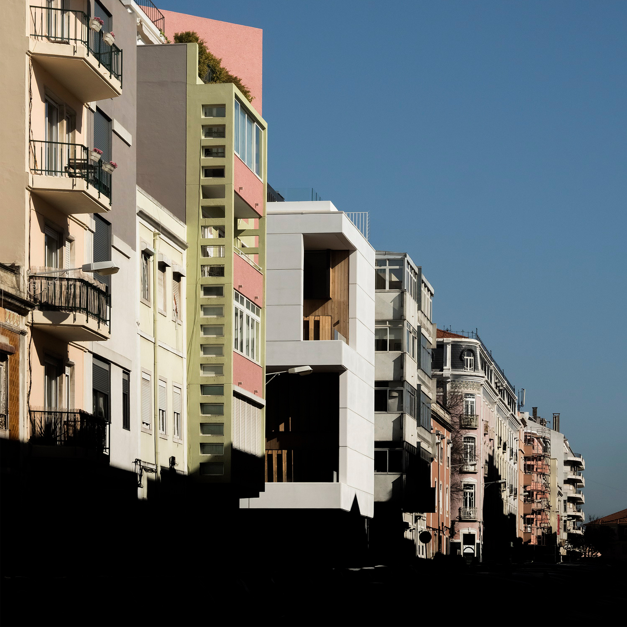 No coração do bairro de Campo de Ourique, em Lisboa este projeto apresenta-se como um singular edifício de habitação multifamiliar. Um marcante volume cúbico que se destaca do embasamento e dos alinhamentos das fachadas dos edifícios confinantes e reinterpreta as características da sua envolvente. Este volume nuclear de betão branco destaca-se do edifício, revestido a pedra escura texturada e abraçando o embasamento e as laterais do edifício. O edifício ganha força por ter no seu vértice dois grandes vazios, desfasados entre si, e que correspondem ao espaço ocupado por dois terraços de pé-direito duplo. Estes pátios suspensos, com portadas de madeira, funcionam como caixas de luz orientadas de acordo com a privacidade e exposição solar respetiva, e foram o ponto de partida para organizar os apartamentos, em duplex.