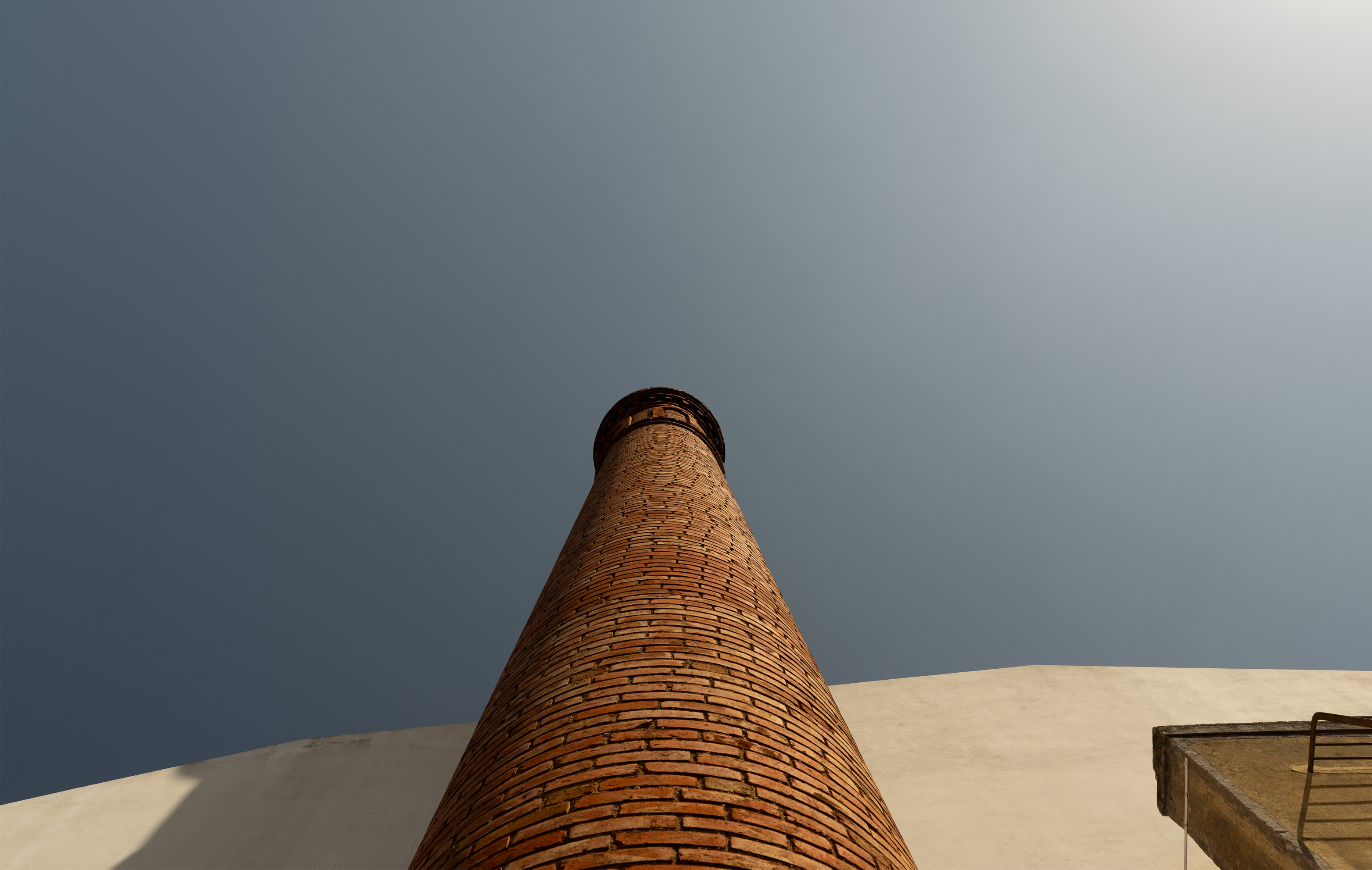 O elemento mais marcante da pré-existência, a chaminé industrial, não só permanece, como se torna o centro do projeto. Vertical e robusta, continua a marcar a silhueta desta esquina e a contar a história do lugar. É agora envolvida por terraços a poente, transformando-se num eixo de convivência entre interior e exterior. A chaminé respira, integrada no edifício, agora não apenas como memória preservada, mas como parte ativa da vivência quotidiana.