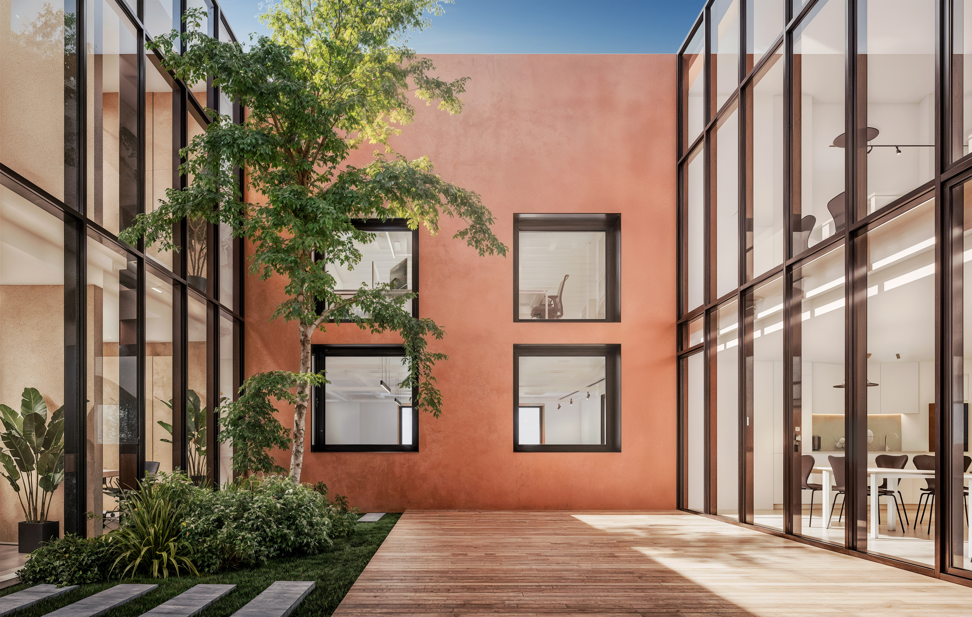 Inserido na dinâmica de reabilitação do património industrial de Alcântara, uma das áreas de Lisboa com um passado fabril marcante, surge Saint-Léger. Com um total de 3.700 m², o projeto de conversão de dois antigos armazéns industriais num moderno complexo de escritórios, preserva a memória industrial enquanto introduz uma nova organização espacial focada no conforto e na flexibilidade. A proposta destaca-se pela criação de pátios ajardinados, elementos centrais para a iluminação natural e qualidade ambiental dos espaços interiores. Estes pátios permitem que a vegetação se desenvolva até às coberturas, promovendo um ambiente mais equilibrado e sustentável.