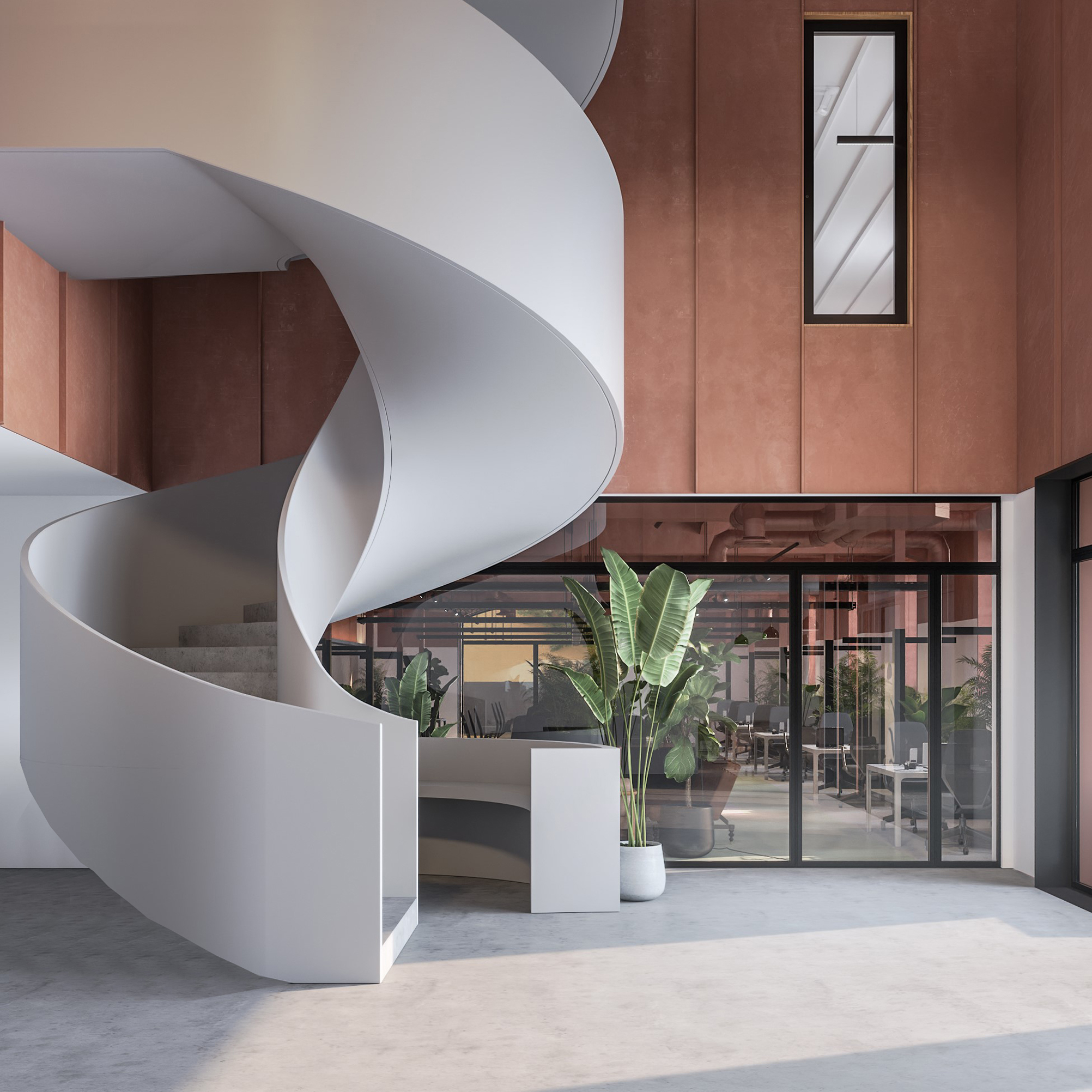 A materialidade assume um papel fundamental na reinterpretação do passado industrial. O uso do metal reforça a identidade do espaço e estabelece um diálogo entre a história e a modernidade. No interior, a distribuição flexível adapta-se às novas necessidades das empresas, equilibrando funcionalidade e bem-estar. Os pisos superiores são ocupados por zonas de escritório em open space e salas de conferência, enquanto o piso térreo se destina a usos semipúblicos, incluindo espaços para eventos. A adaptação dos antigos armazéns a um ambiente de trabalho confortável exigiu a criação de aberturas estratégicas e claraboias para garantir luminosidade e ventilação adequadas. A altura generosa dos espaços permitiu a introdução de um segundo piso, maximizando a área útil sem comprometer a estrutura original.